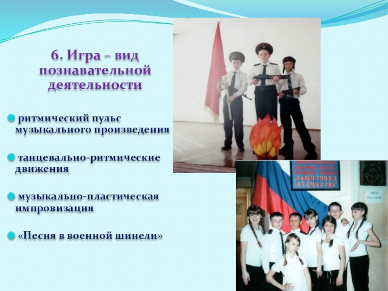 6. Игра – вид познавательной деятельности ритмический пульс музыкального произведения танцевально-ритмические движения музыкально-пластическая импровизация «Песня в военной