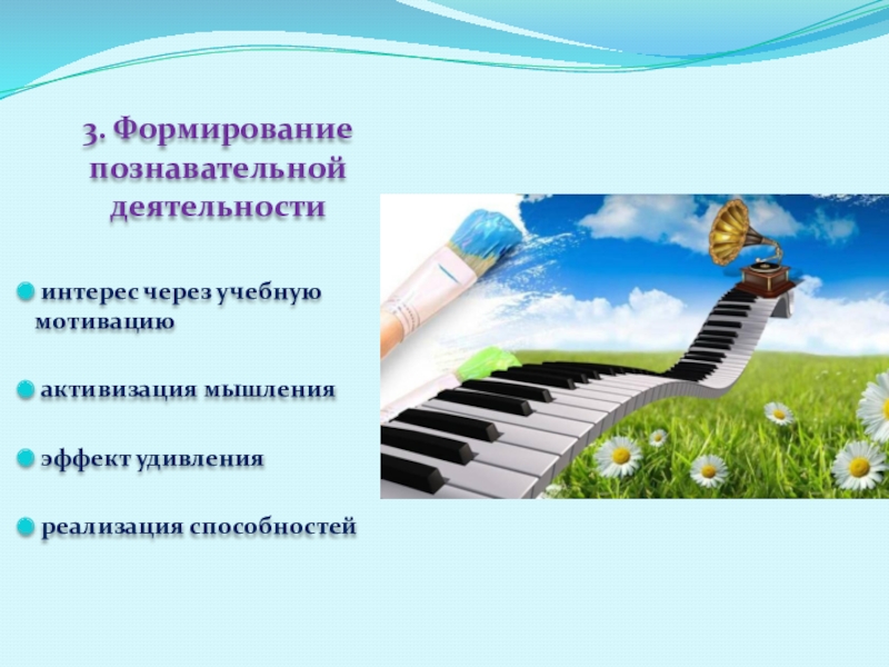 3. Формирование познавательной деятельности интерес через учебную мотивацию активизация мышления эффект удивления реализация способностей