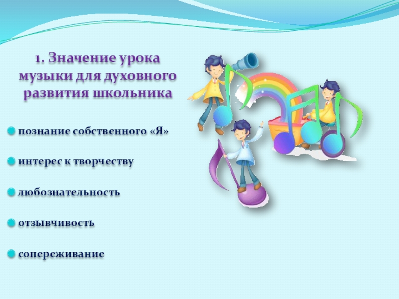 1. Значение урока музыки для духовного развития школьника познание собственного «Я» интерес к творчеству любознательность отзывчивость сопереживание