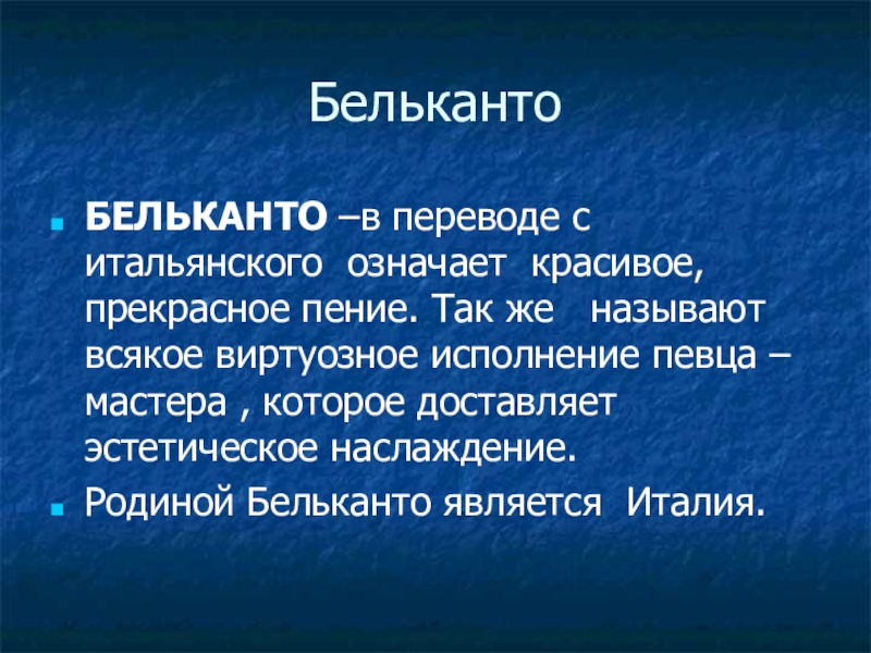 БЕЛЬКАНТО –в переводе с итальянского означает красивое, прекрасное пение. Так же