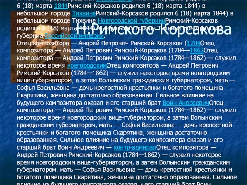 Отец композитора — Андрей Петрович Римский-Корсаков (1784Отец композитора — Андрей Петрович Римский-Корсаков (1784—1862Отец композитора — Андрей Петрович Римский-Корсаков (1784—1862) — служил некоторое время новгородскимОтец композитора — Андрей Петрович Римский-Корсаков (1784—1862) — служил некоторое время новгородским вице-губернатором, а затем Волынским гражданским губернатором, мать — Софья Васильевна — дочь крепостной крестьянки и богатого помещика Скарятина, женщина достаточно образованная. Сильное влияние на будущего композитора оказал и его старший брат Воин АндреевичОтец композитора — Андрей Петрович Римский-Корсаков (1784—1862) — служил некоторое время новгородским вице-губернатором, а затем Волынским гражданским губернатором, мать — Софья Васильевна — дочь крепостной крестьянки и богатого помещика Скарятина, женщина достаточно образованная. Сильное влияние на будущего композитора оказал и его старший брат Воин Андреевич — контр-адмиралОтец композитора — Андрей Петрович Римский-Корсаков (1784—1862) — служил некоторое время новгородским вице-губернатором, а затем Волынским гражданским губернатором, мать — Софья Васильевна — дочь крепостной крестьянки и богатого помещика Скарятина, женщина достаточно образованная. Сильное влияние на будущего композитора оказал и его старший брат Воин Андреевич — контр-адмирал, реорганизатор системы военно-морского образования. Семейный дом Римских-Корсаковых находился на берегу реки ТихвинкиОтец композитора — Андрей Петрович Римский-Корсаков (1784—1862) — служил некоторое время новгородским вице-губернатором, а затем Волынским гражданским губернатором, мать — Софья Васильевна — дочь крепостной крестьянки и богатого помещика Скарятина, женщина достаточно образованная. Сильное влияние на будущего композитора оказал и его старший брат Воин Андреевич — контр-адмирал, реорганизатор системы военно-морского образования. Семейный дом Римских-Корсаковых находился на берегу реки Тихвинки, напротив Тихвинского Богородичного Успенского монастыря.