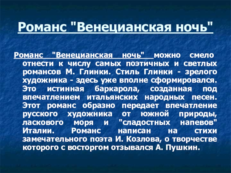 поэтичных и светлых романсов М. Глинки. Стиль Глинки - зрелого художника - здесь уже вполне сформировался. Это истинная баркарола, созданная под впечатлением итальянских народных песен. Этот романс образно передает впечатление русского художника от южной природы, ласкового моря и "сладостных напевов" Италии. Романс написан на стихи замечательного поэта И. Козлова, о творчестве которого с восторгом отзывался А. Пушкин.