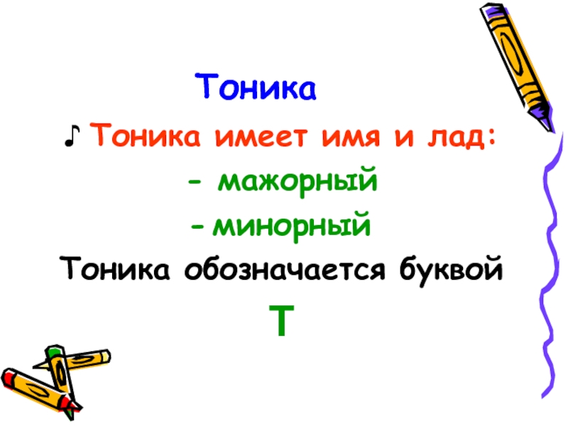 Тоника♪ Тоника имеет имя и лад:- мажорныйминорныйТоника обозначается буквойТ