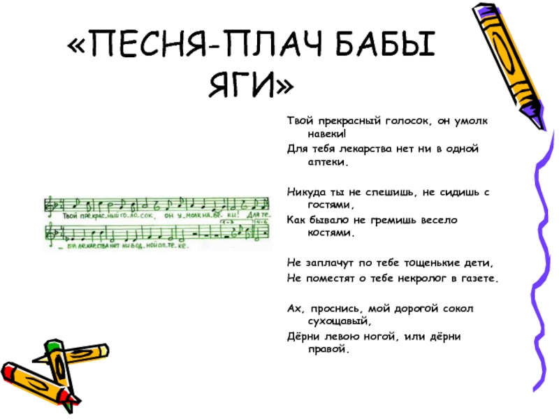 «ПЕСНЯ-ПЛАЧ БАБЫ ЯГИ»Твой прекрасный голосок, он умолк навеки!Для тебя лекарства нет ни в одной аптеки.Никуда ты не