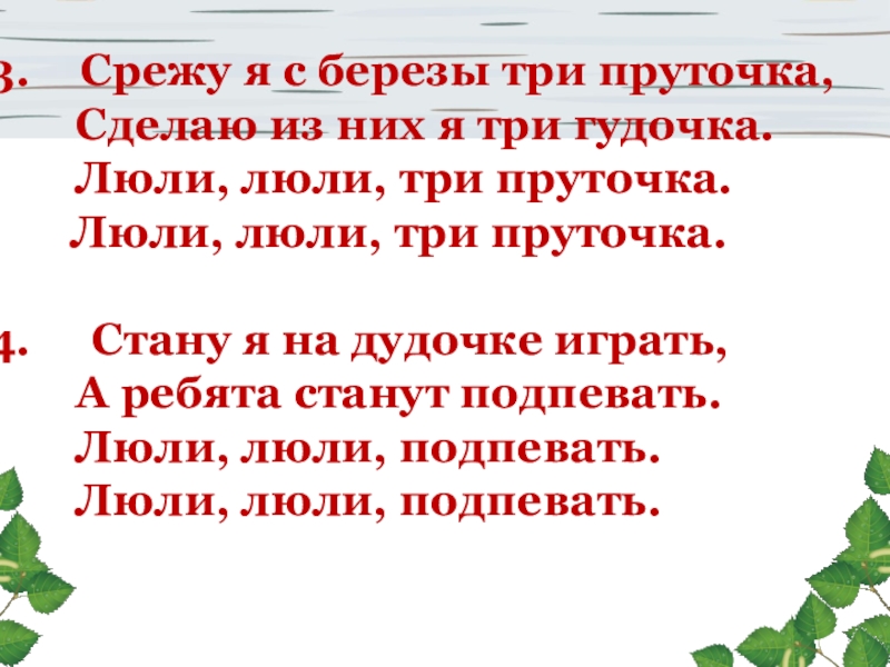 Срежу я с березы три пруточка,   Сделаю из них я три гудочка.   Люли,