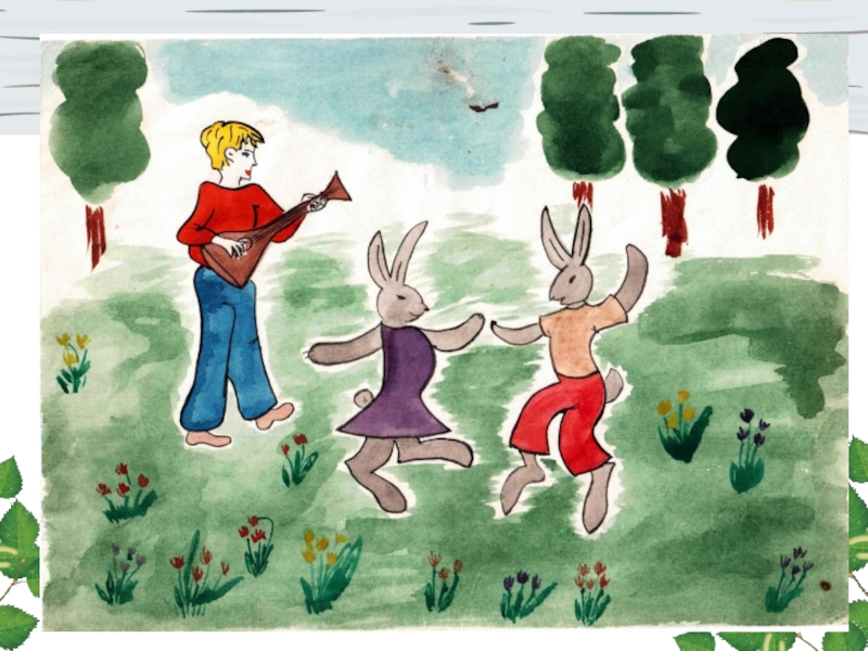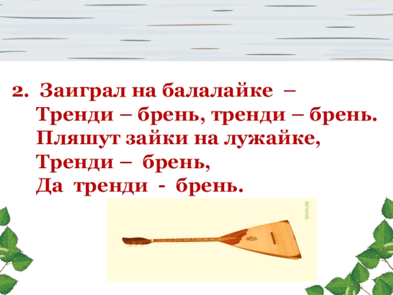 2. Заиграл на балалайке –   Тренди – брень, тренди – брень.   Пляшут зайки