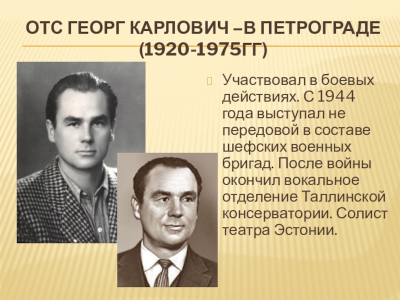 года выступал не передовой в составе шефских военных бригад. После войны окончил вокальное отделение Таллинской консерватории. Солист театра Эстонии.