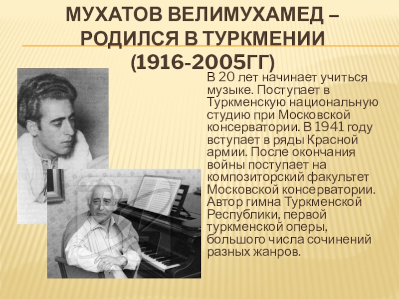 музыке. Поступает в Туркменскую национальную студию при Московской консерватории. В 1941 году вступает в ряды Красной армии. После окончания войны поступает на композиторский факультет Московской консерватории. Автор гимна Туркменской Республики, первой туркменской оперы, большого числа сочинений разных жанров.