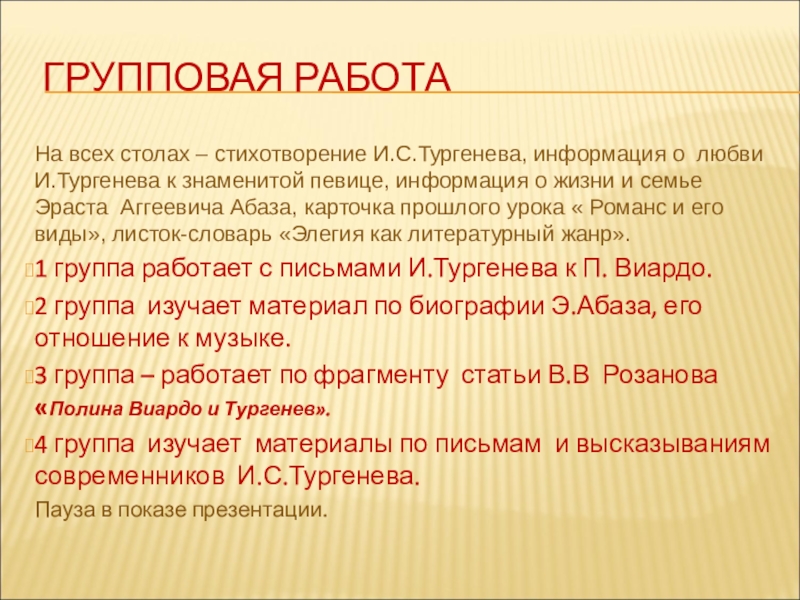 3 группа – работает по фрагменту статьи В.В Розанова «Полина Виардо и Тургенев».