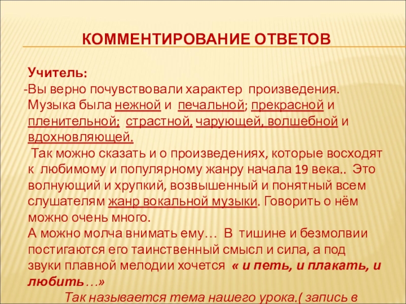 Так можно сказать и о произведениях, которые восходят к любимому и популярному жанру начала 19 века.. Это волнующий и хрупкий, возвышенный и понятный всем слушателям жанр вокальной музыки. Говорить о нём можно очень много.