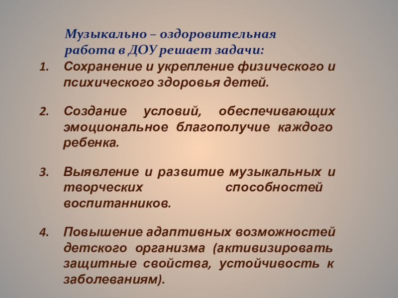 Музыкально – оздоровительная работа в ДОУ решает задачи: