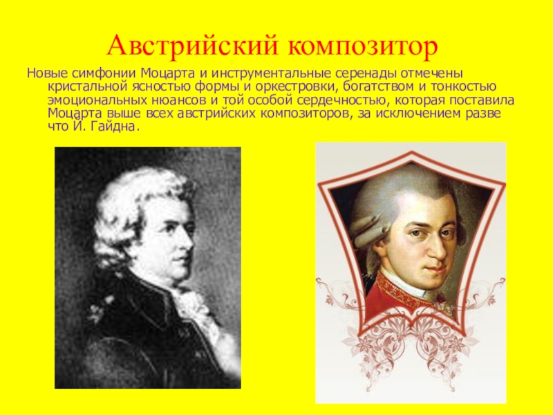 Австрийский композиторНовые симфонии Моцарта и инструментальные серенады отмечены кристальной ясностью формы и оркестровки, богатством и тонкостью эмоциональных