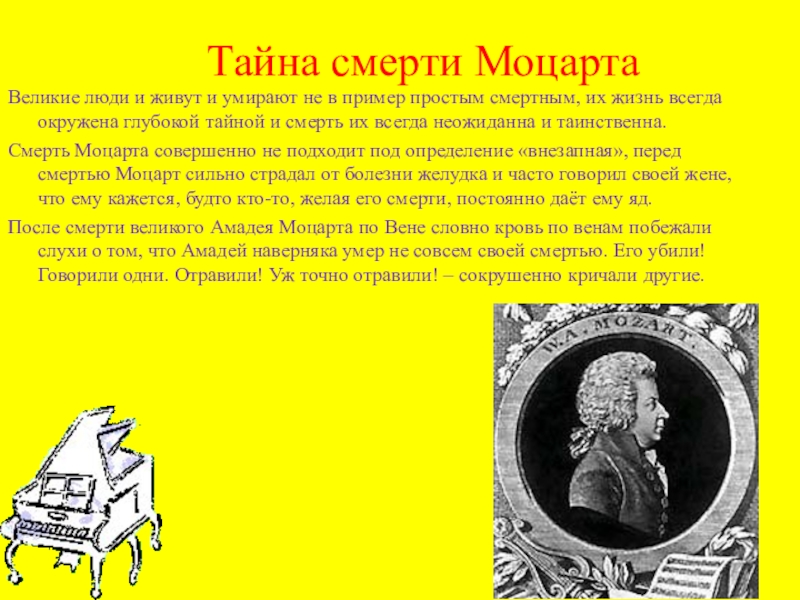 Тайна смерти МоцартаВеликие люди и живут и умирают не в пример простым смертным, их жизнь всегда окружена