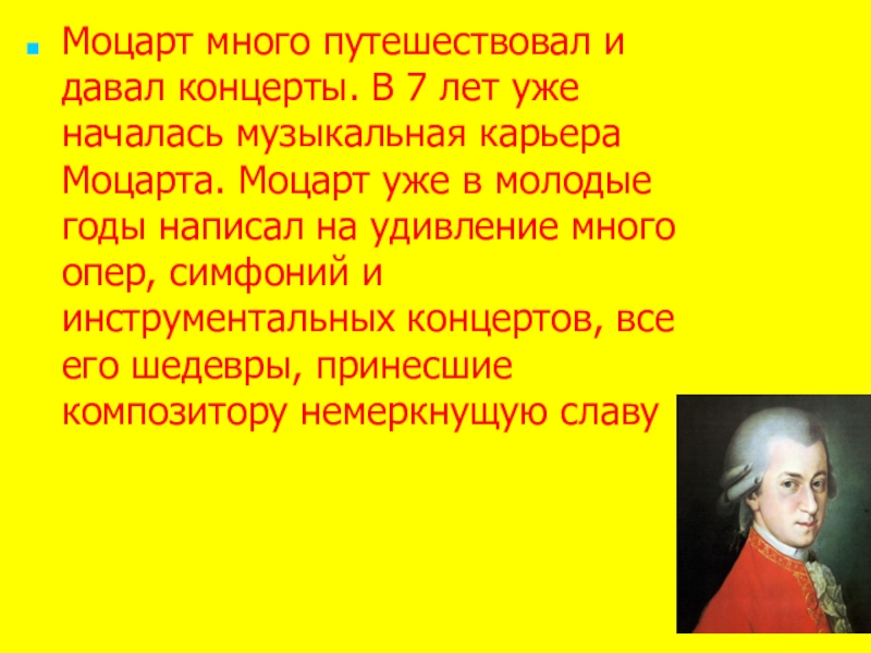 Моцарт много путешествовал и давал концерты. В 7 лет уже началась музыкальная карьера Моцарта. Моцарт уже в