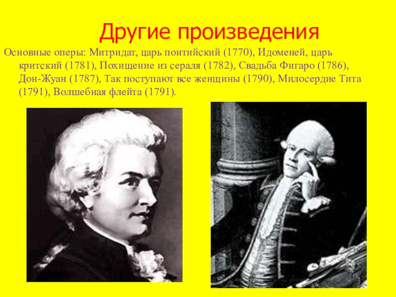 Другие произведенияОсновные оперы: Митридат, царь понтийский (1770), Идоменей, царь критский (1781), Похищение из сераля (1782), Свадьба Фигаро
