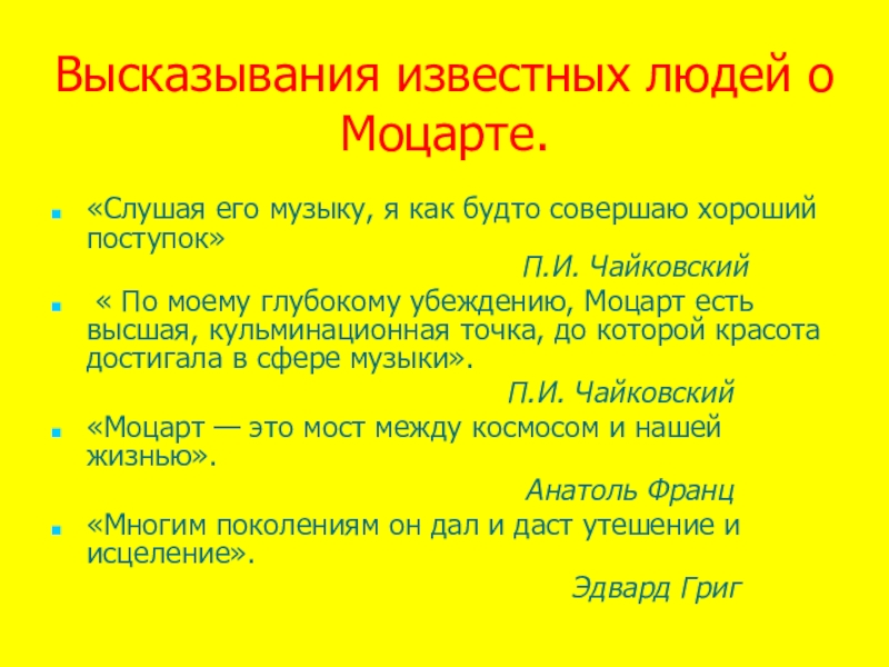Высказывания известных людей о Моцарте.«Слушая его музыку, я как будто совершаю хороший поступок»