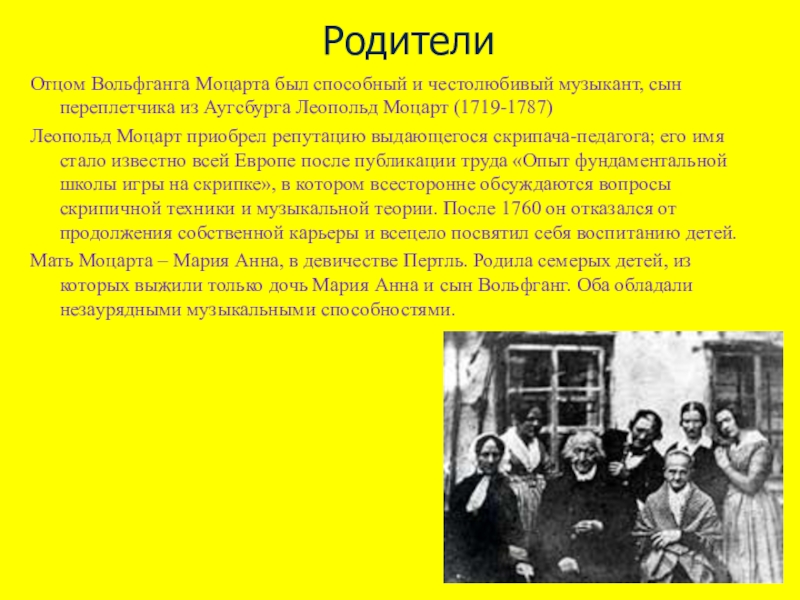 РодителиОтцом Вольфганга Моцарта был способный и честолюбивый музыкант, сын переплетчика из Аугсбурга Леопольд Моцарт (1719-1787)Леопольд Моцарт приобрел