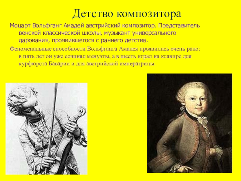 Детство композитораМоцарт Вольфганг Амадей австрийский композитор. Представитель венской классической школы, музыкант универсального дарования, проявившегося с раннего детства.