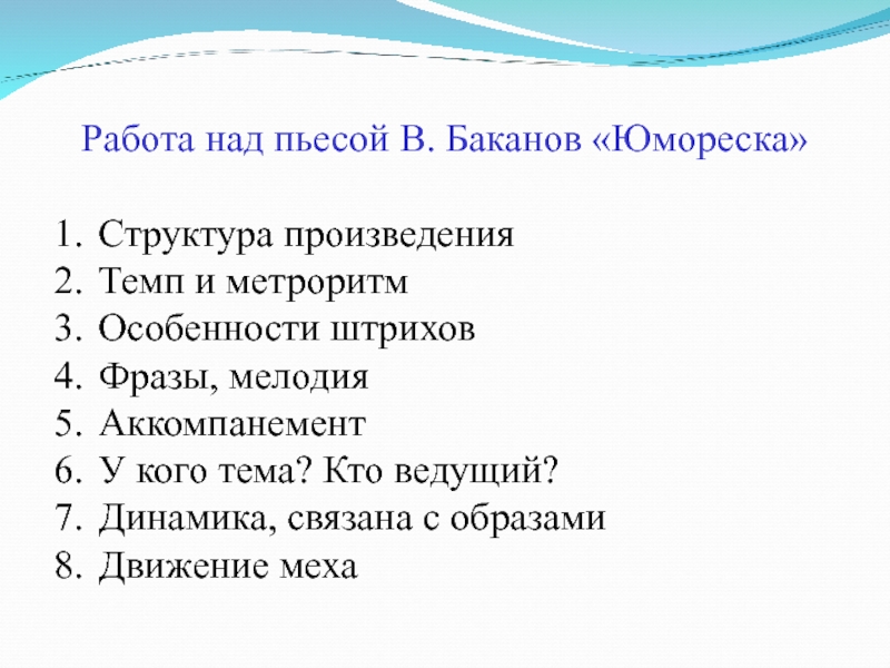 Слайд 8Работа над пьесой В. Баканов «Юмореска»