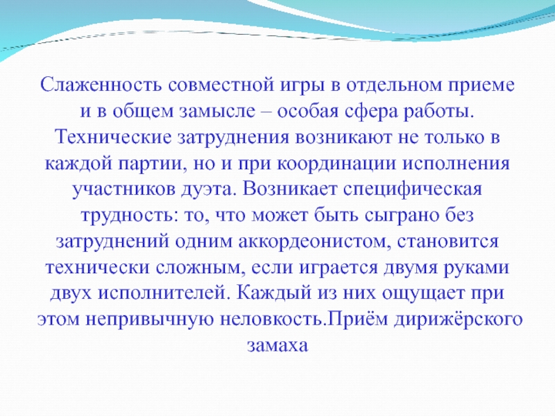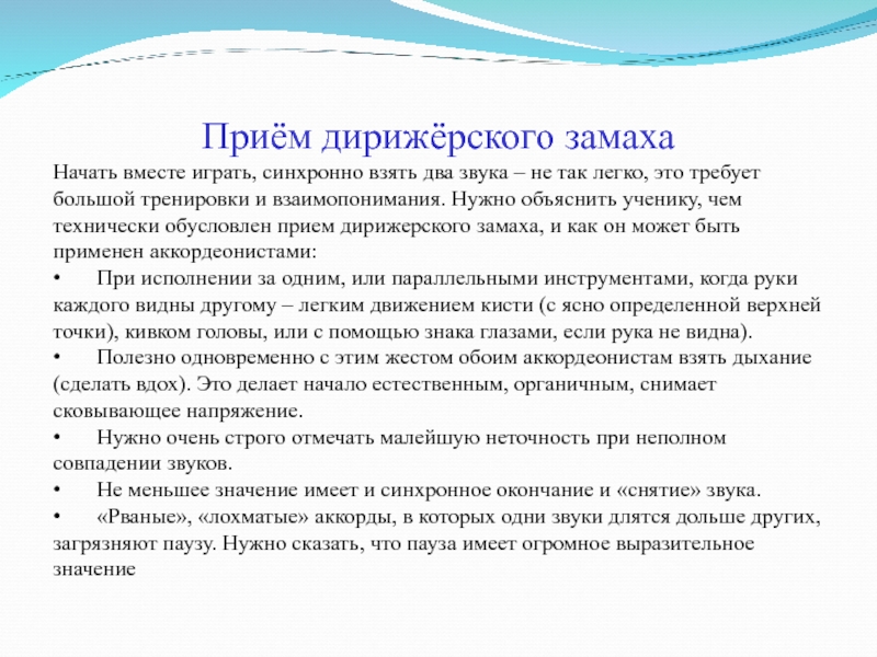 так легко, это требует большой тренировки и взаимопонимания. Нужно объяснить ученику, чем технически обусловлен прием дирижерского замаха, и как он может быть применен аккордеонистами: