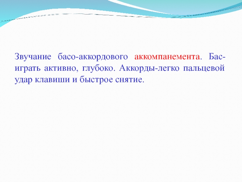 Слайд 15Звучание басо-аккордового аккомпанемента. Бас-играть активно, глубоко. Аккорды-легко пальцевой удар клавиши и