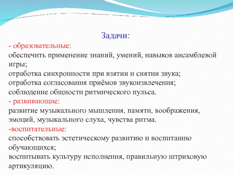 • Ансамблевое музицирование обладает огромным развивающим потенциалом всего комплекса способностей учащегося: музыкального слуха, памяти, ритмического чувства, двигательно-моторных навыков; расширяется музыкальный кругозор; воспитывается и формируется художественный вкус, понимание стиля, формы произведения.