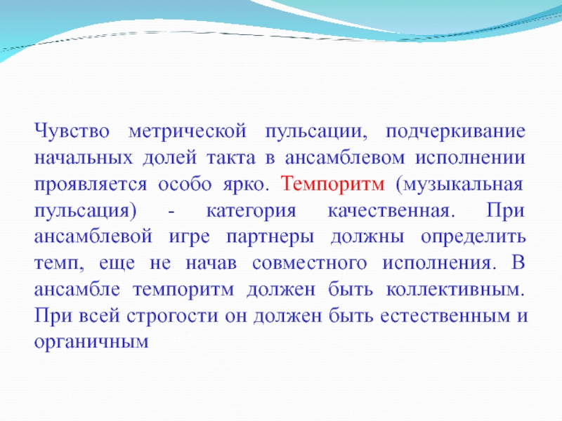 Слайд 13Чувство метрической пульсации, подчеркивание начальных долей такта в ансамблевом исполнении проявляется