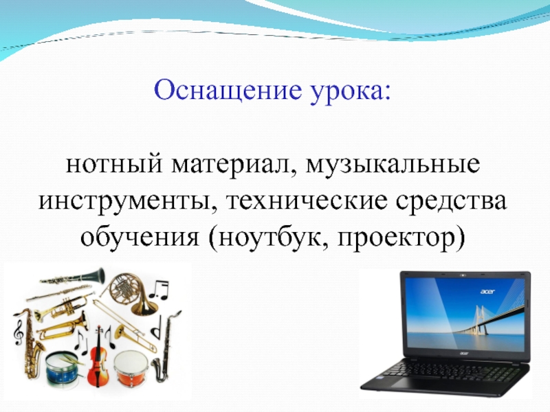нотный материал, музыкальные инструменты, технические средства обучения (ноутбук, проектор)