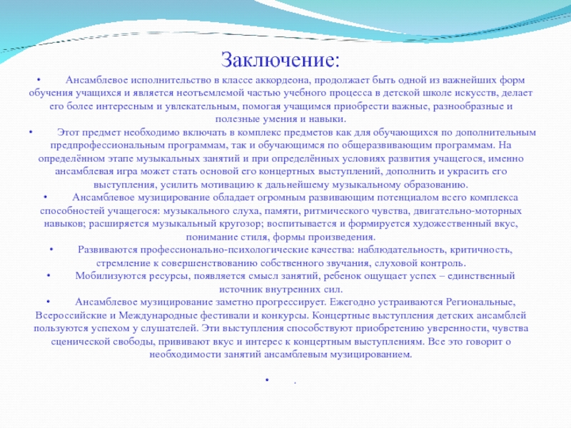 • Ансамблевое исполнительство в классе аккордеона, продолжает быть одной из важнейших форм