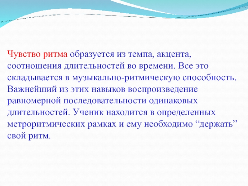 Важнейший из этих навыков воспроизведение равномерной последовательности одинаковых длительностей. Ученик находится в определенных метроритмических рамках и ему необходимо “держать” свой ритм.