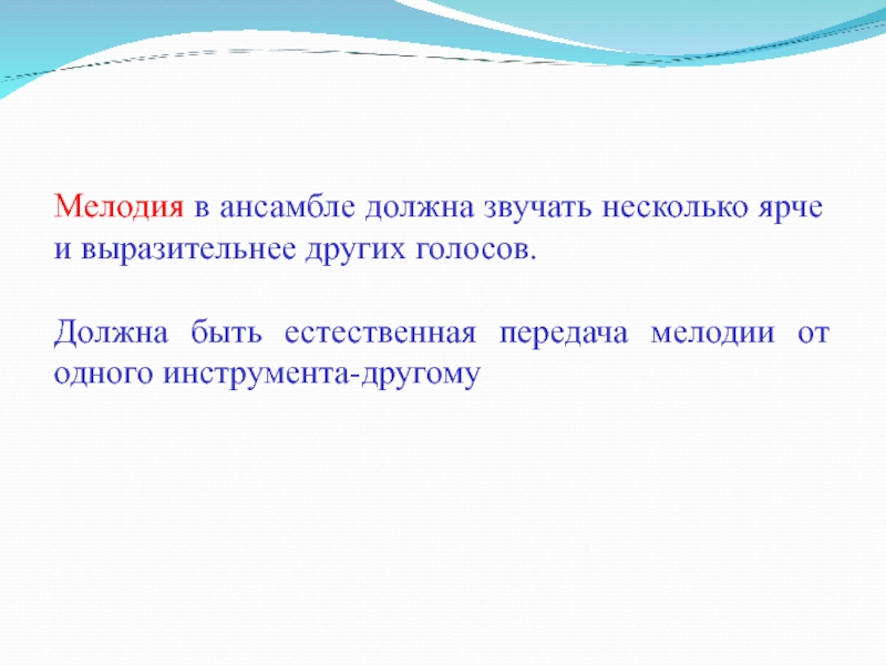 Слайд 14Мелодия в ансамбле должна звучать несколько ярче и выразительнее других голосов.