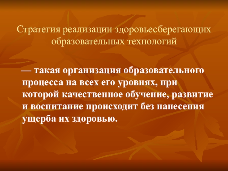 на всех его уровнях, при которой качественное обучение, развитие и воспитание происходит без нанесения ущерба их здоровью.