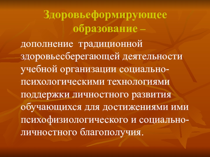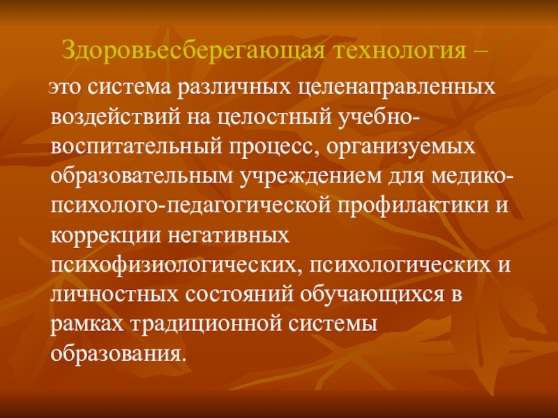 целостный учебно-воспитательный процесс, организуемых образовательным учреждением для медико-психолого-педагогической профилактики и коррекции негативных психофизиологических, психологических и личностных состояний обучающихся в рамках традиционной системы образования.