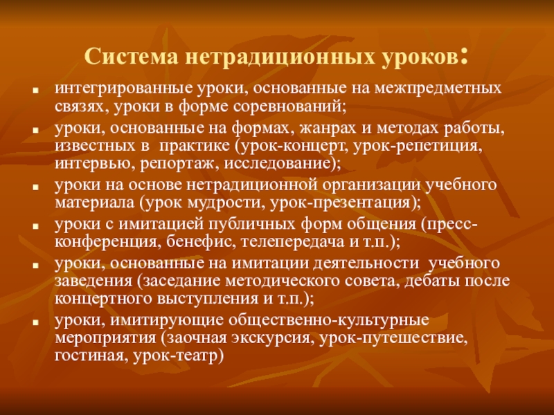 уроки на основе нетрадиционной организации учебного материала (урок мудрости, урок-презентация);