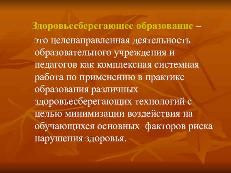 педагогов как комплексная системная работа по применению в практике образования различных здоровьесберегающих технологий с целью минимизации воздействия на обучающихся основных факторов риска нарушения здоровья.