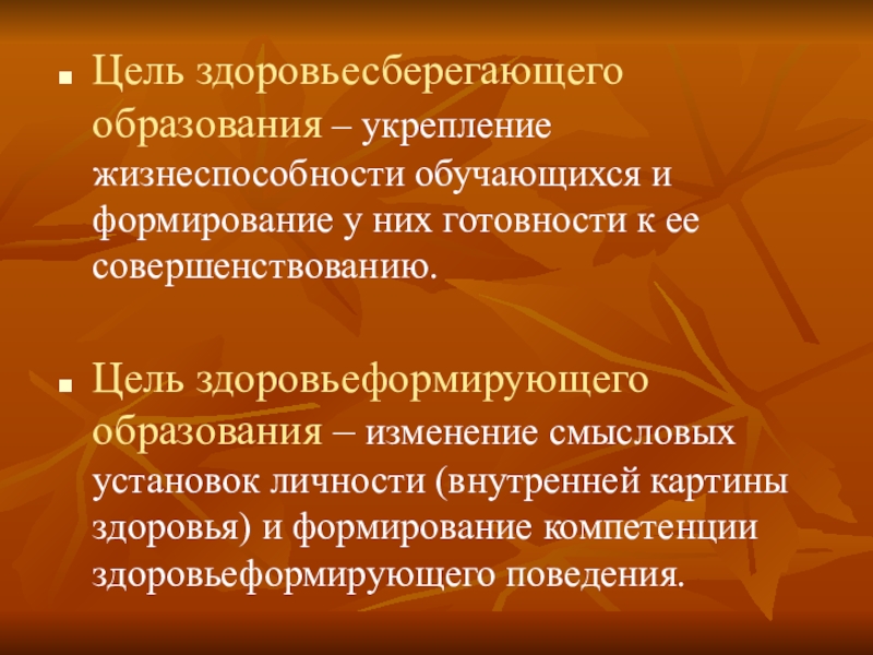 Слайд 10Цель здоровьесберегающего образования – укрепление жизнеспособности обучающихся и формирование у них
