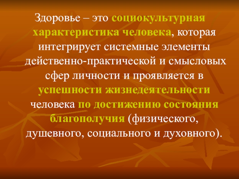 Слайд 4Здоровье – это социокультурная характеристика человека, которая интегрирует системные элементы действенно-практической