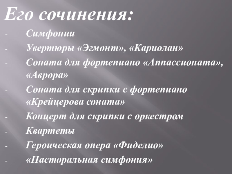 Его сочинения:СимфонииУвертюры «Эгмонт», «Кариолан»Соната для фортепиано «Аппассионата», «Аврора»Соната для скрипки с фортепиано «Крейцерова соната»Концерт для скрипки с