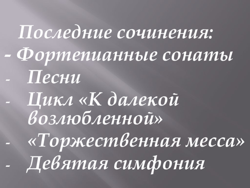 Последние сочинения:- Фортепианные сонатыПесниЦикл «К далекой возлюбленной»«Торжественная месса»Девятая симфония