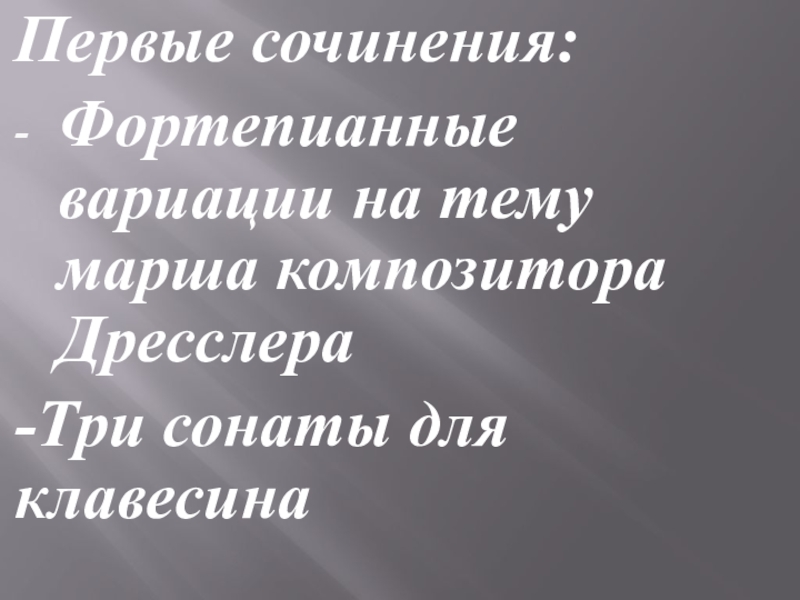 Первые сочинения:Фортепианные  вариации на тему марша композитора Дресслера-Три сонаты для клавесина