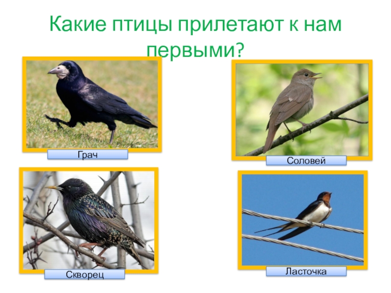 Какие птицы прилетают к нам первыми? ГрачСоловейСкворецЛасточка