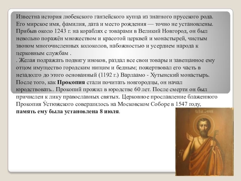 . Желая подражать подвигу иноков, раздал все свои товары и завещанное ему отцом имущество городским нищим и бедным; пожертвовал его часть в незадолго до этого основанный (1192 г.) Варлаамо - Хутынский монастырь. После того, как Прокопия стали почитать новгородцы, он начал юродствовать.. Прокопий прожил в юродстве 60 лет. После смерти он был причислен к лику православных святых. Церковное прославление блаженного Прокопия У́стюжского совершилось на Московском Соборе в 1547 году, память ему была установлена 8 июля.