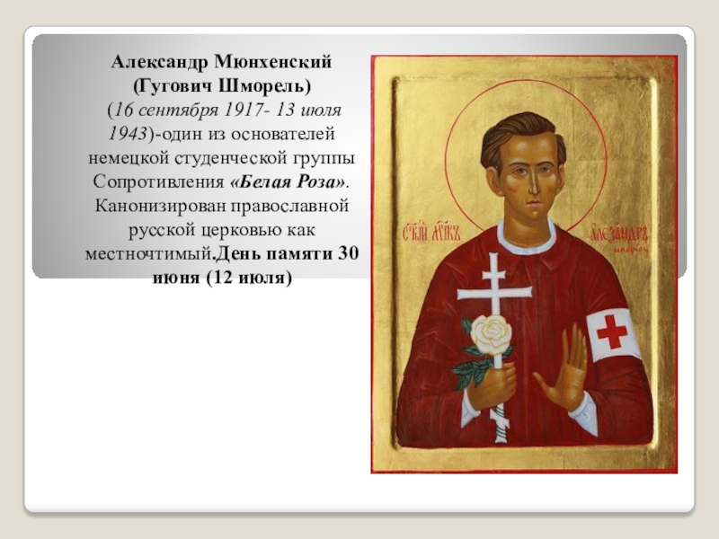 основателей немецкой студенческой группы Сопротивления «Белая Роза». Канонизирован православной русской церковью как местночтимый.День памяти 30 июня (12 июля)