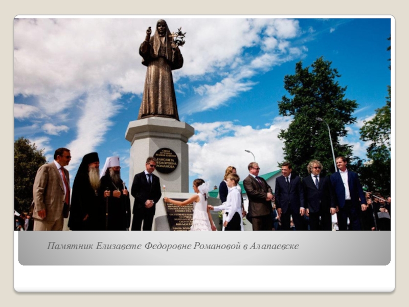Слайд 15Памятник Елизавете Федоровне Романовой в Алапаевске