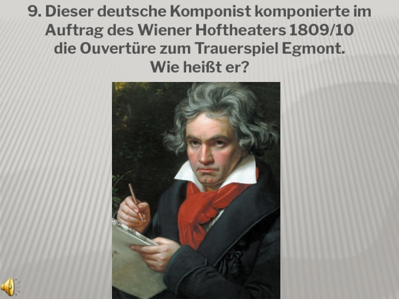 Слайд 109. Dieser deutsche Komponist komponierte im Auftrag des Wiener Hoftheaters 1809/10 die Ouvertüre zum Trauerspiel Egmont.
