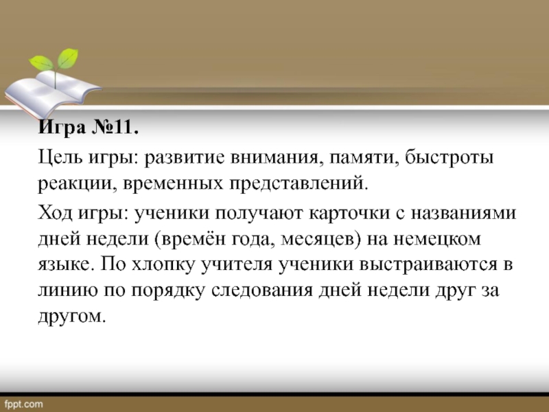 ученики получают карточки с названиями дней недели (времён года, месяцев) на немецком языке. По хлопку учителя ученики выстраиваются в линию по порядку следования дней недели друг за другом.