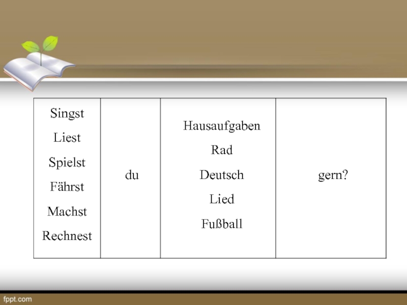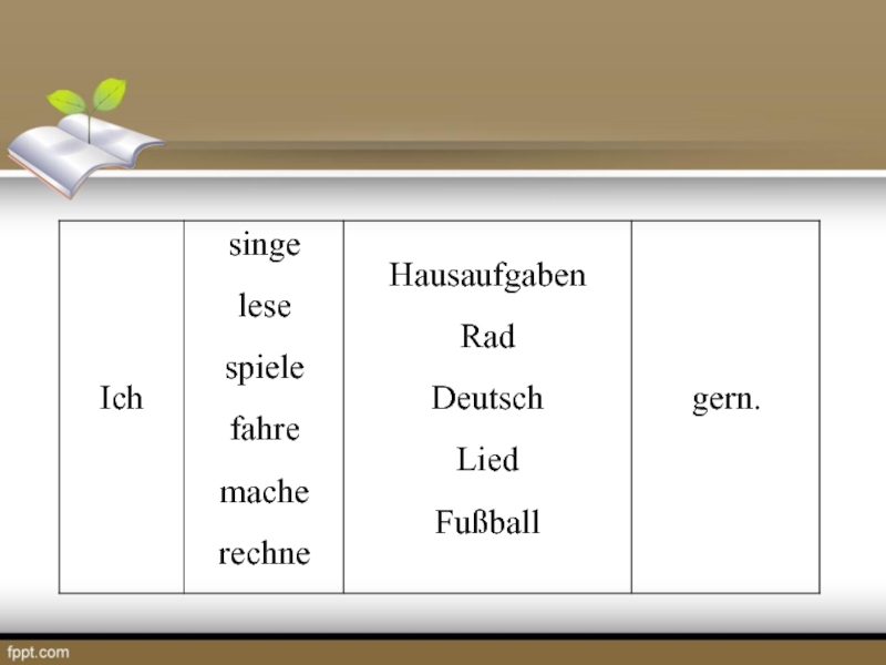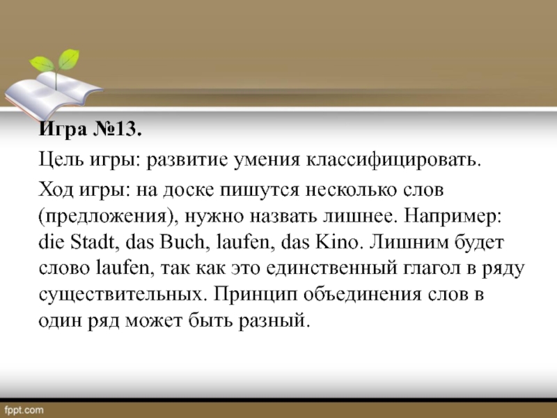 слов (предложения), нужно назвать лишнее. Например: die Stadt, das Buch, laufen, das Kino. Лишним будет слово laufen, так как это единственный глагол в ряду существительных. Принцип объединения слов в один ряд может быть разный.