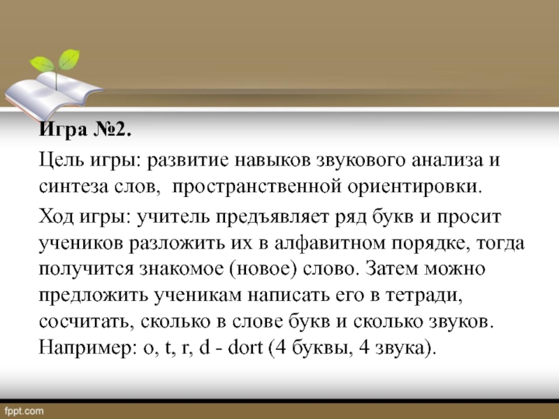 Ход игры: учитель предъявляет ряд букв и просит учеников разложить их в алфавитном порядке, тогда получится знакомое (новое) слово. Затем можно предложить ученикам написать его в тетради, сосчитать, сколько в слове букв и сколько звуков. Например: o, t, r, d - dort (4 буквы, 4 звука).