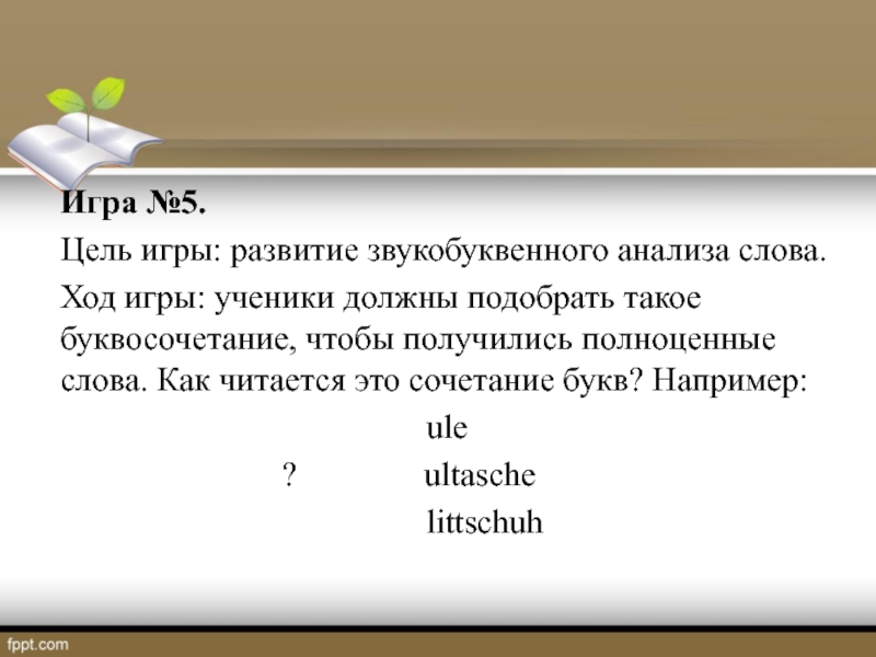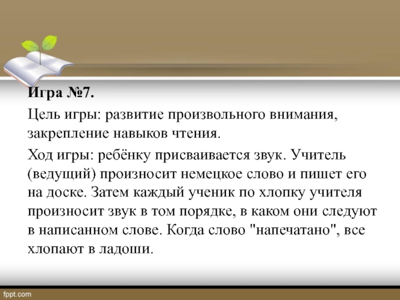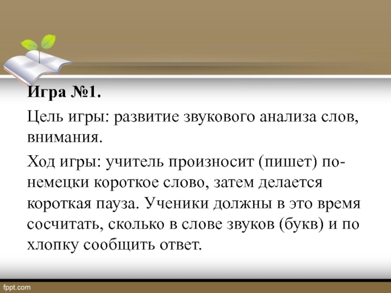 произносит (пишет) по-немецки короткое слово, затем делается короткая пауза. Ученики должны в это время сосчитать, сколько в слове звуков (букв) и по хлопку сообщить ответ.