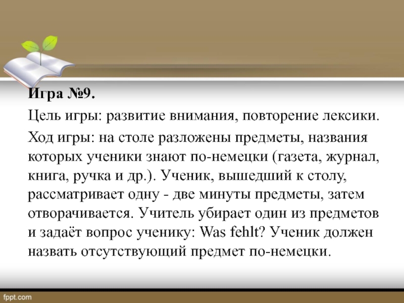 предметы, названия которых ученики знают по-немецки (газета, журнал, книга, ручка и др.). Ученик, вышедший к столу, рассматривает одну - две минуты предметы, затем отворачивается. Учитель убирает один из предметов и задаёт вопрос ученику: Was fehlt? Ученик должен назвать отсутствующий предмет по-немецки.